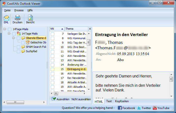Allerdings sollte die Datenrettung in diesem Fall von geschultem Personal durchgeführt werden weil dieses sich mit der Wiederherstellung einer solchen Datei genau auskennt. Im Anzeigebereich bildet das Tool die interne Ordnerstruktur des Archivs als Navigations-Baum ab und zeigt in der Vorschau E-Mails mitsamt Kopfzeilen an entweder in HTML-Formatierung oder als Reintext. Nun aber das wichtigste.